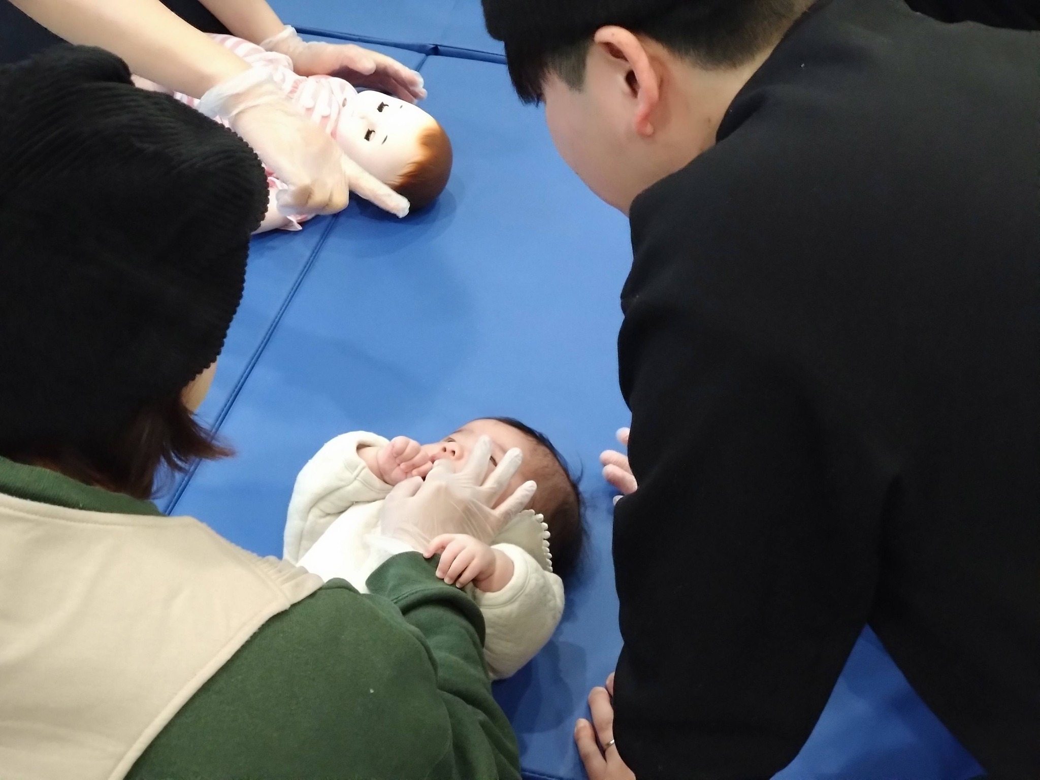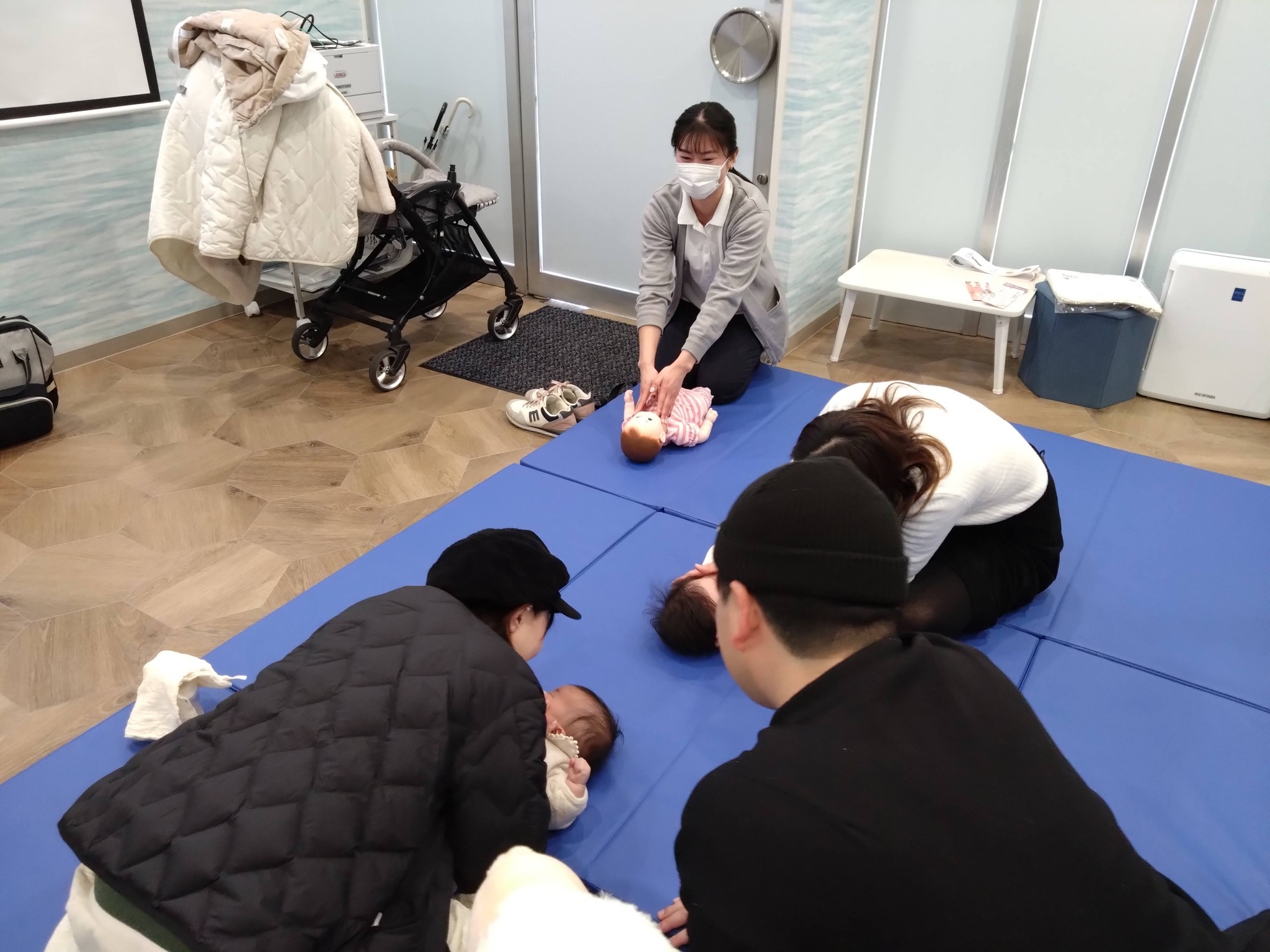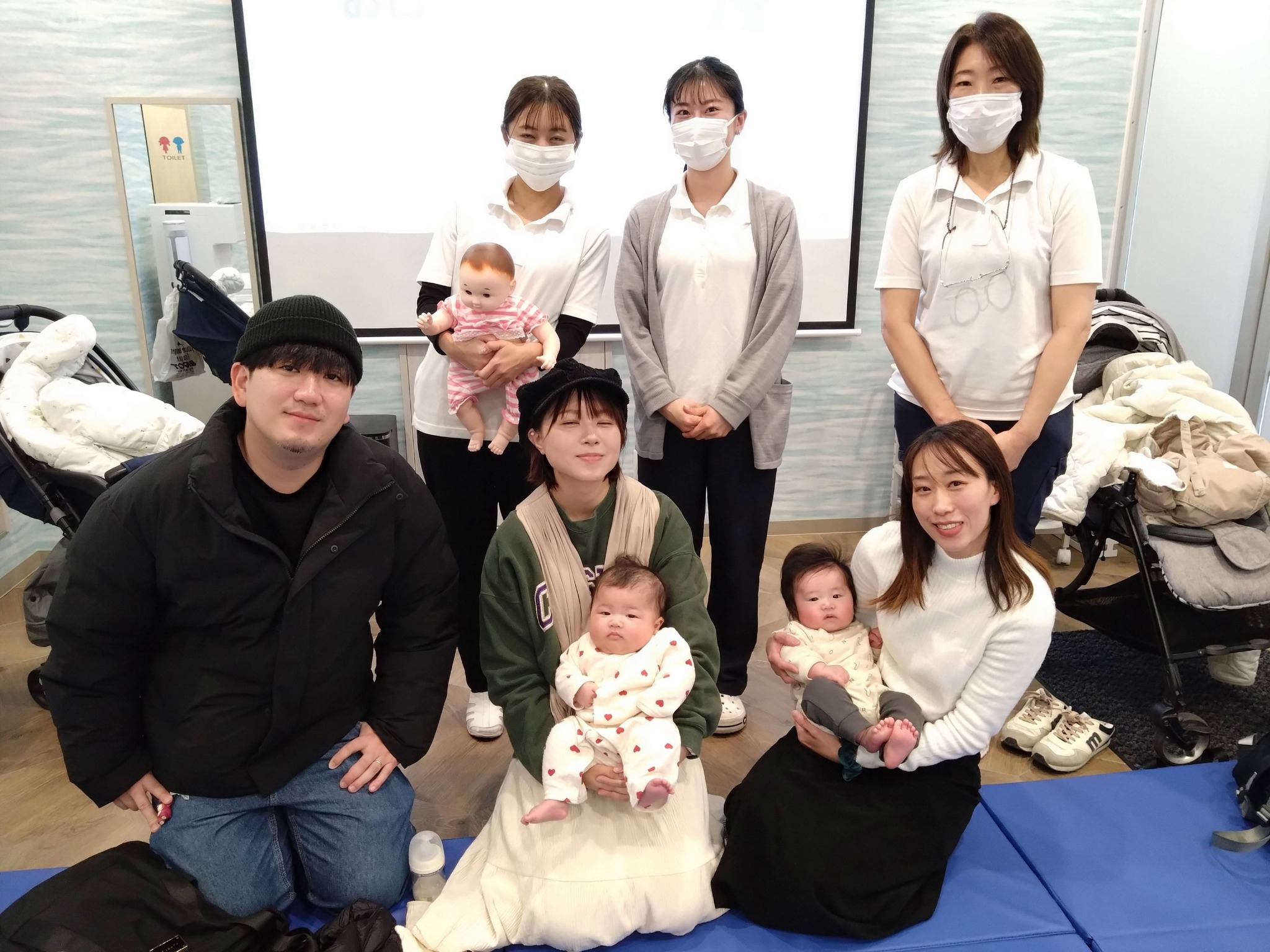 MFTのお部屋にマットを敷いて、身体遊び、お口マッサージ、離乳食の与え方や水分摂取の実習も楽しくできました。